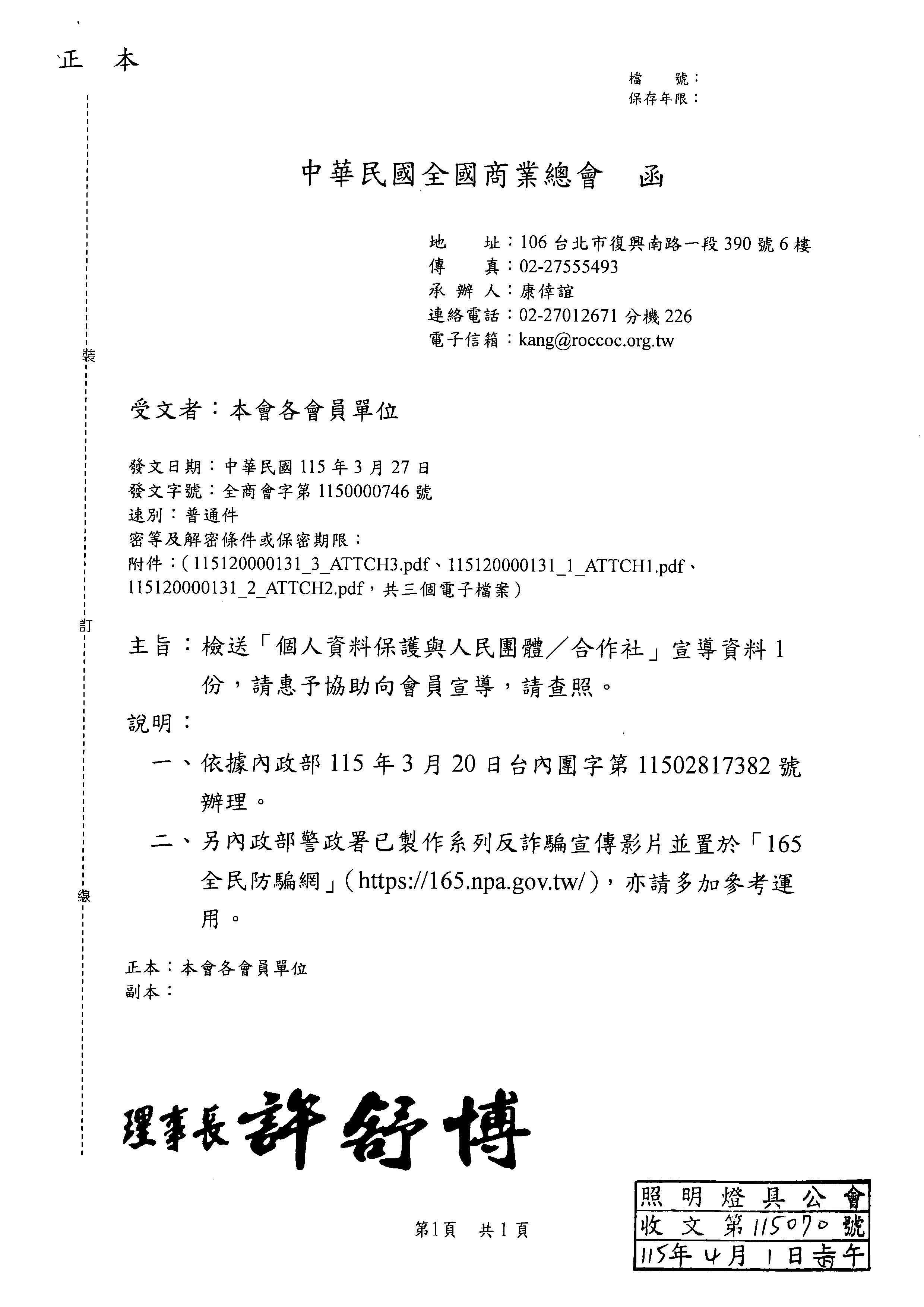 中華民國全國商業總會轉知:內政部警政署輔導個人資料保護意識及詐騙宣導訊息