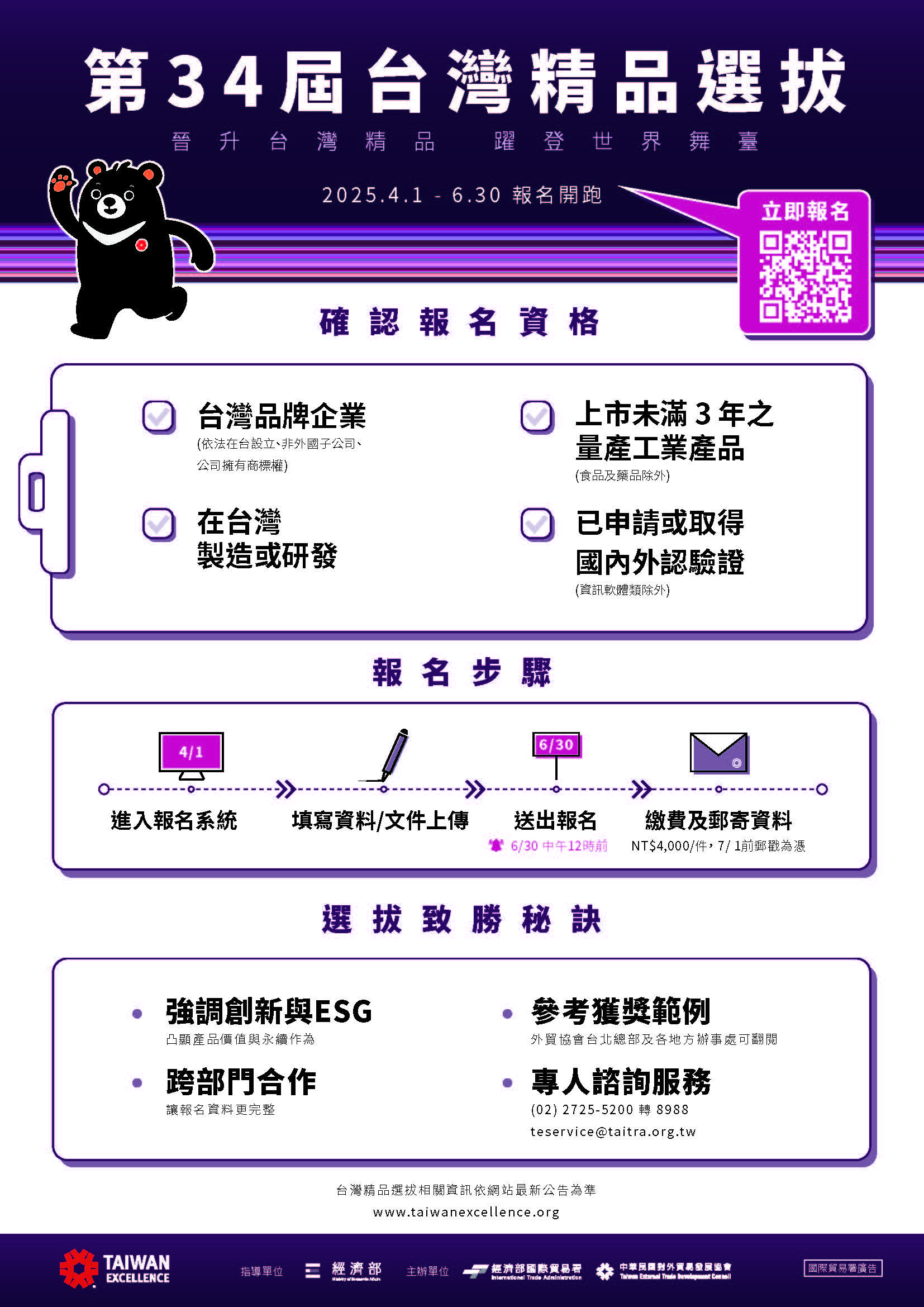 在全球市場競爭激烈的時代,品牌的國際能見度與影響力至關重要,由經濟部設立的台灣精品獎,正是讓品牌獲得更多關注、讓國際看見的最佳推手。第34屆台灣精品選拔現正開放報名中,至6月30日中午12時止,誠摯邀請 貴公司報名參加,敬請把握機會。