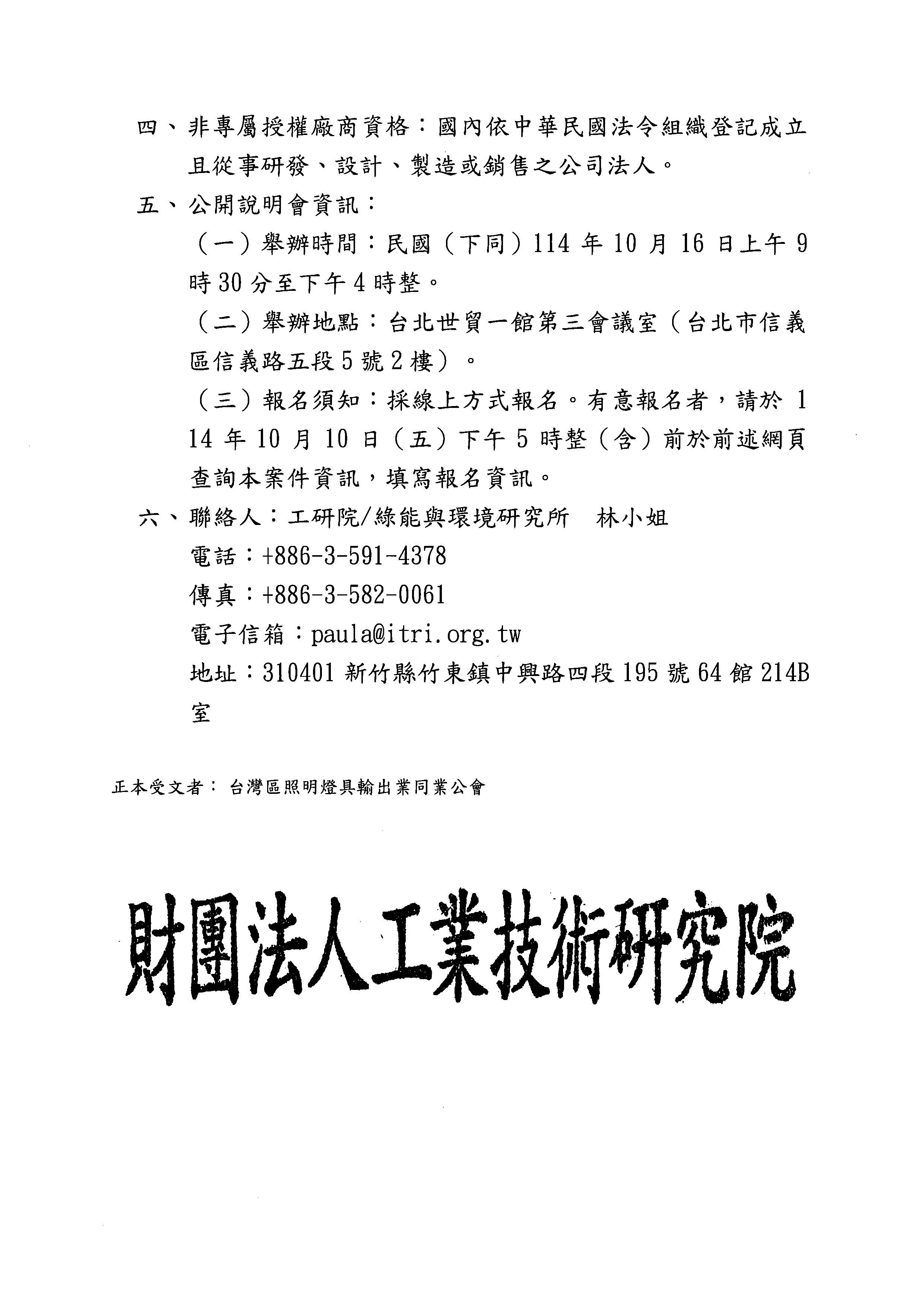 財團法人工業技術研究院:綠能與環境研究所辦理「114年度工研院冷凍空調、智慧監控及能源與電力管理技術等相關研發成果非專屬授權案」公開說明會。