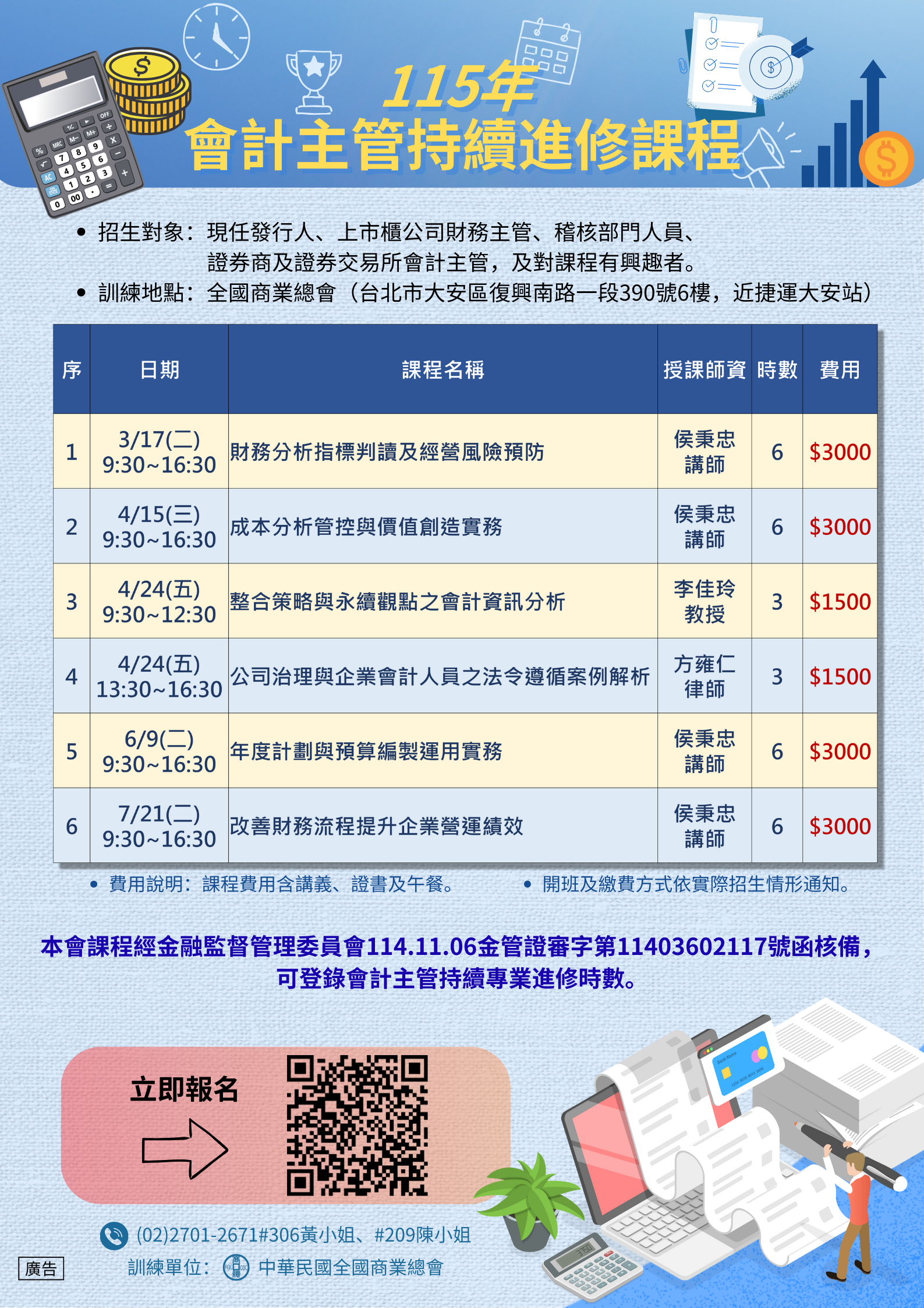 一、為協助會計主管及相關財務人員持續精進專業職能,依據金融監督管理委員會所發布之「發行人證券商證券交易所會計主管資格條件及專業進修辦法」,本會規劃辦理「115年會計主管持續進修課程」,透過系統化課程設計,強化相關人員在專業知識與實務應用上的能力。