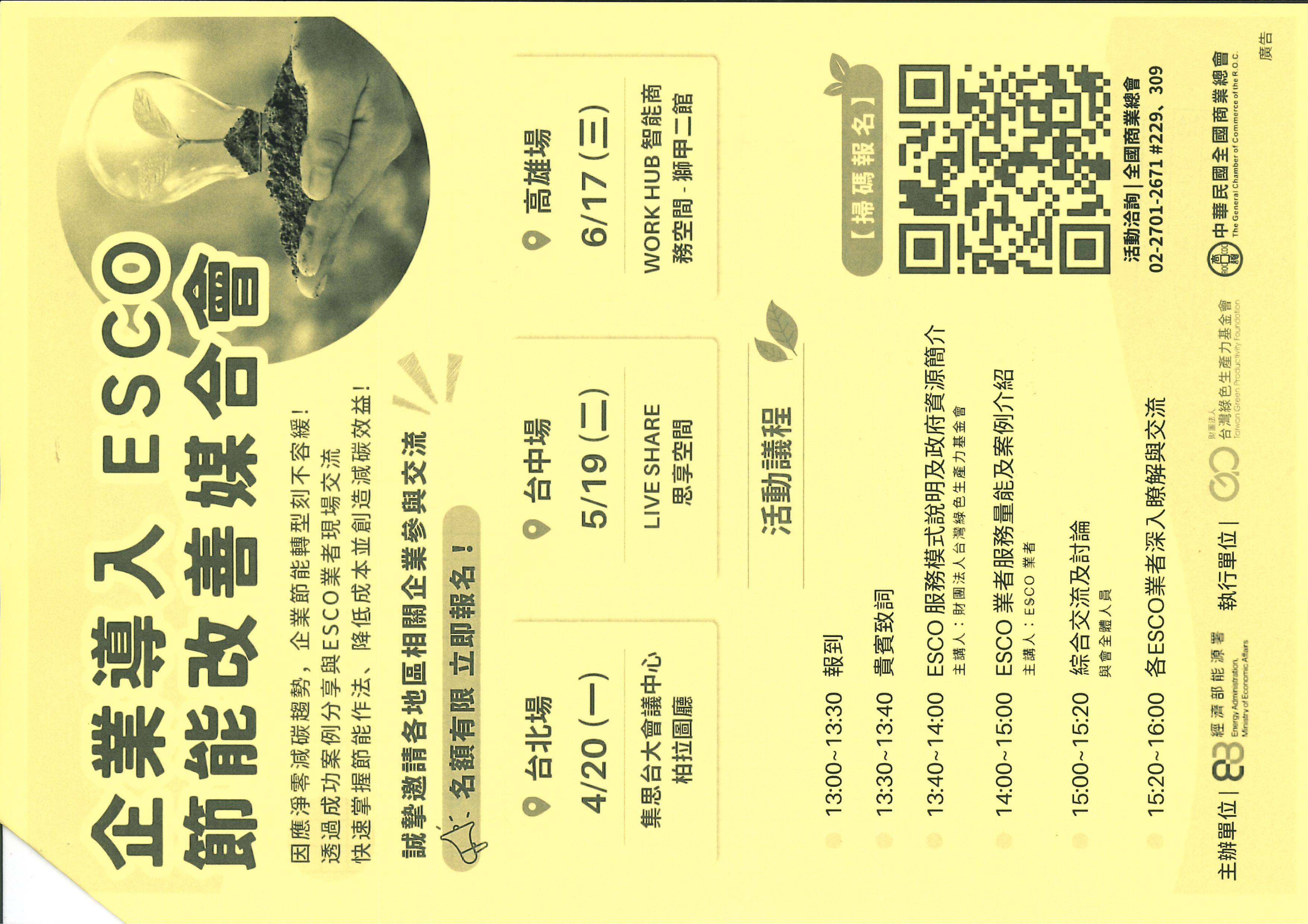 中華民國全國商業總會:辦理「企業導入ESCO節能改善媒合會」共三場,請踴躍報名。