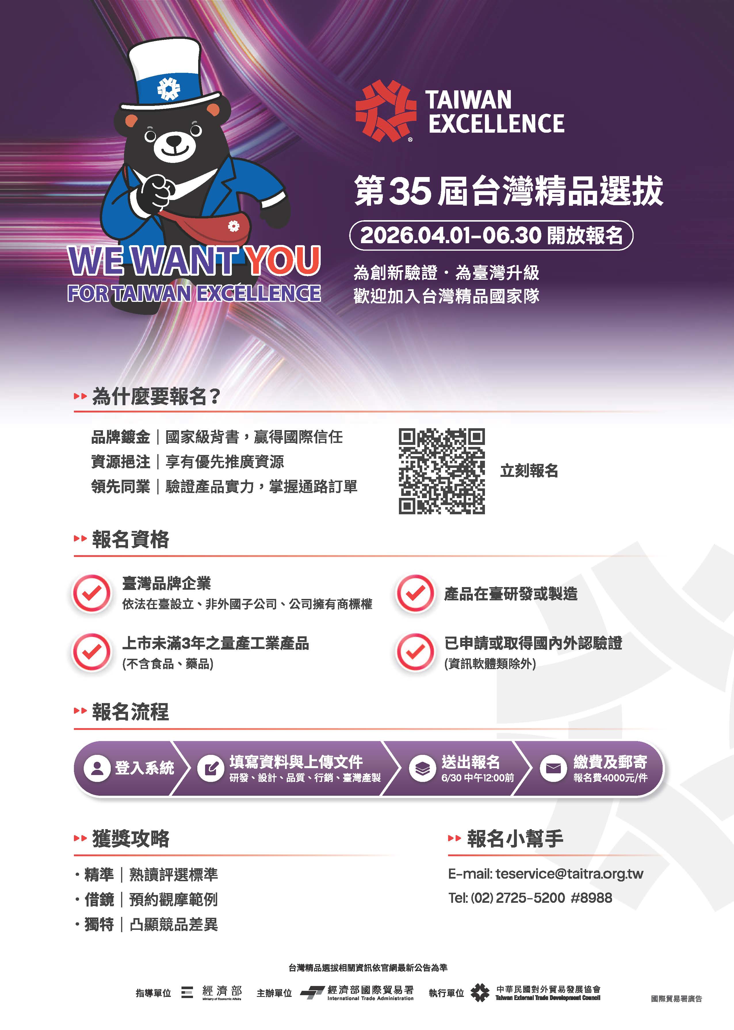 財團法人中華民國對外貿易發展協會公告: 4月1日起至6月30日止開始辦理「第35屆台灣精品選拔」活動,敬請企業廠商踴躍報名。