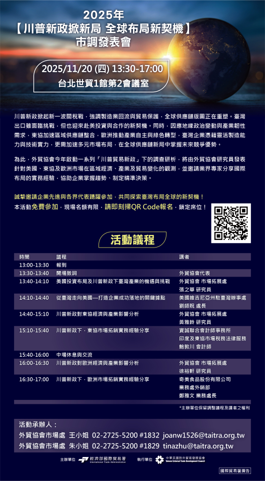 川普新政掀起新一波關稅戰,強調製造業回流與貿易保護,全球供應鏈版圖正在重塑。臺灣出口雖面臨挑戰,但也迎來赴美投資與合作的新契機。同時,因應地緣政治變動與產業韌性需求,東協加速區域供應鏈整合,歐洲推動產業自主與綠色轉型,臺灣企業憑藉靈活製造能力與技術實力,更需加速多元市場布局,在全球供應鏈新局中掌握未來競爭優勢。為此,外貿協會今年啟動一系列「川普貿易新政」下的調查研析,並將於11月20日舉辦【全球經貿新局商機洞察】市調發表會。會中將由外貿協會研究員發表針對美國、東協及歐洲市場在區域經濟、產業及貿易變化的觀測,並邀請業界專家分享國際布局的實務經驗,協助企業掌握趨勢、制定精準決策。