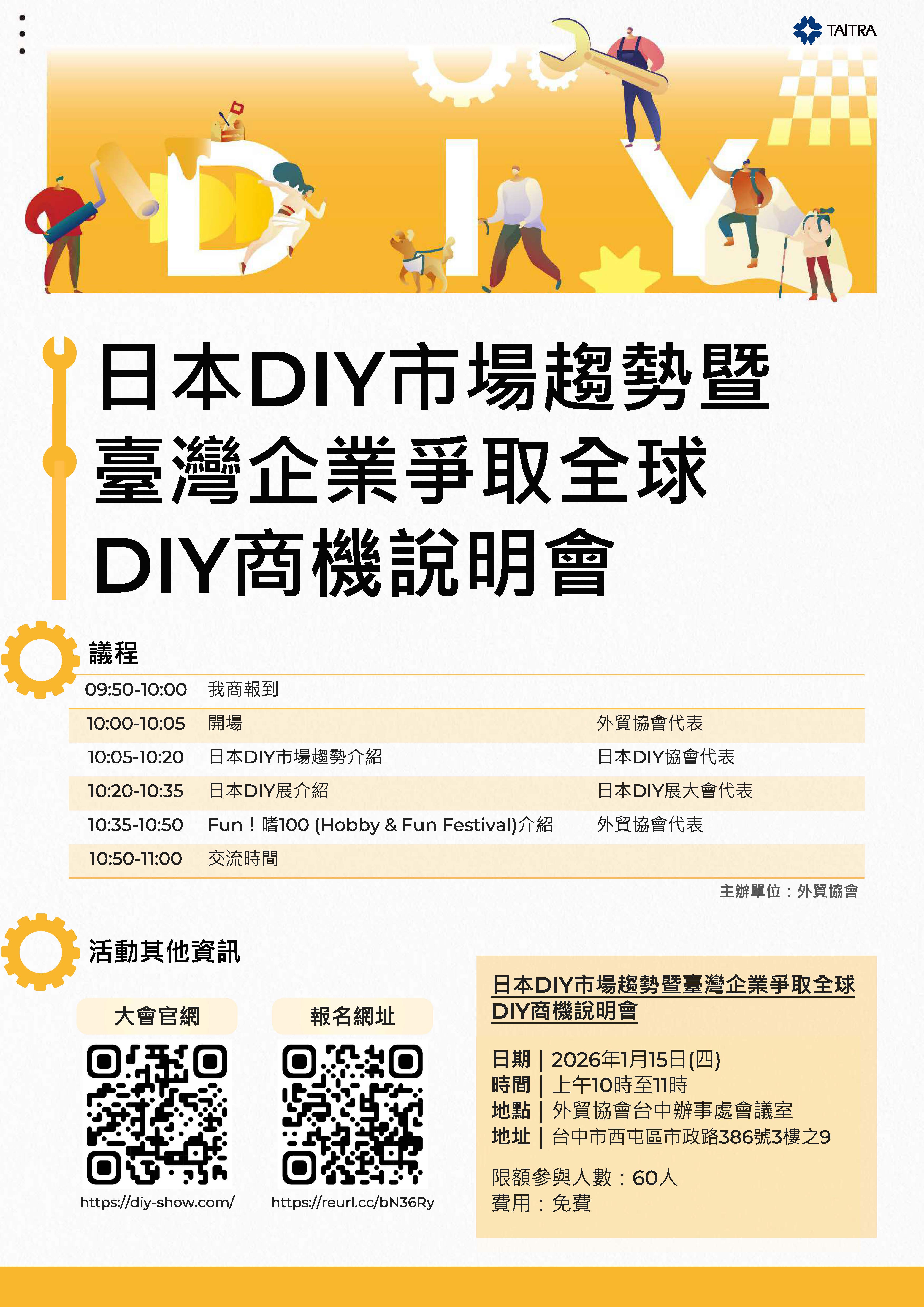 本說明會特別邀請日本DIY協會來台分享日本 DIY 市場最新趨勢,深入解析消費動向、通路發展與國際合作契機,協助臺灣企業掌握關鍵資訊、精準布局海外市場。協會產業代表將分享第一手市場觀察,並介紹日本最大 DIY 展會和您分享第一手資訊,拓展國際商機。 無論您是工具、建材、居家修繕、手作材料或生活風格相關產業,本說明會將是您開拓日本及全球 DIY 市場的最佳起點。名額有限,歡迎踴躍報名參加!