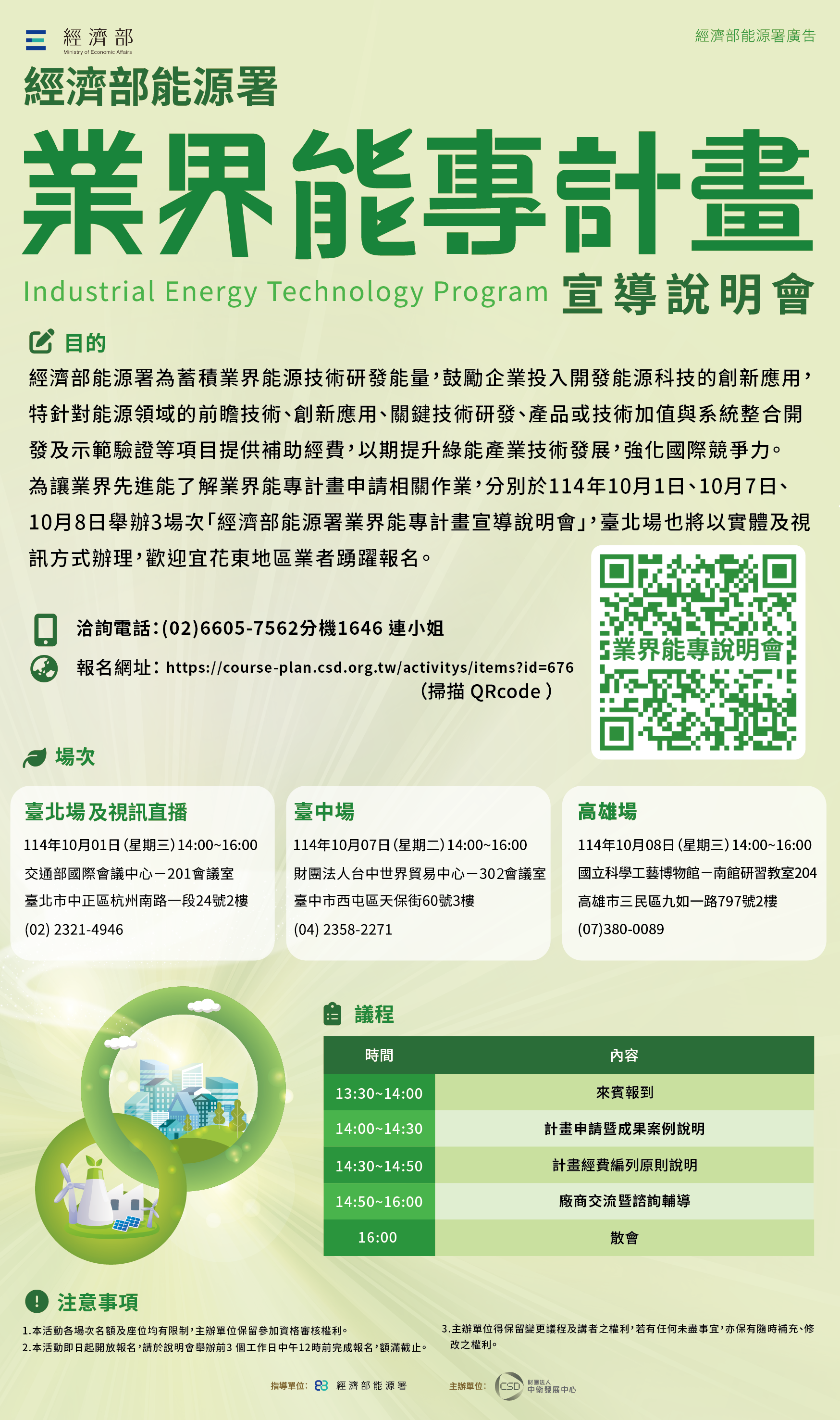 114年度經濟部能源署業界能專計畫宣導說明會分別於 10/1臺北(視訊直播)、10/7臺中、10/8高雄 舉辦3場次說明會,臺北場將同步採視訊直播方式,歡迎宜花東地區業者踴躍報名