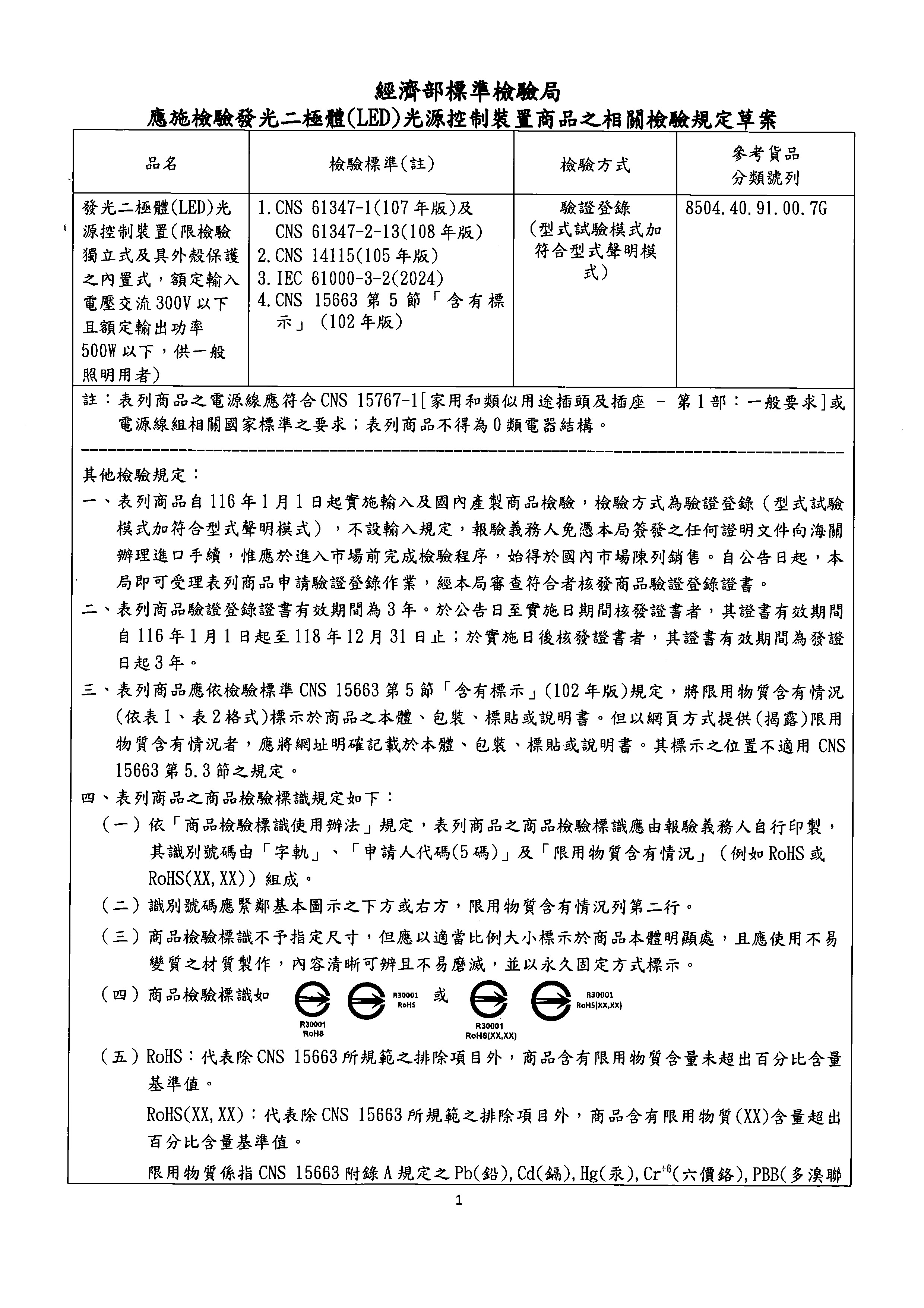 經濟部標準檢驗局-「應施檢驗發光二極體(LED)光源控制裝置商品之相關檢 驗規定」訂定草案