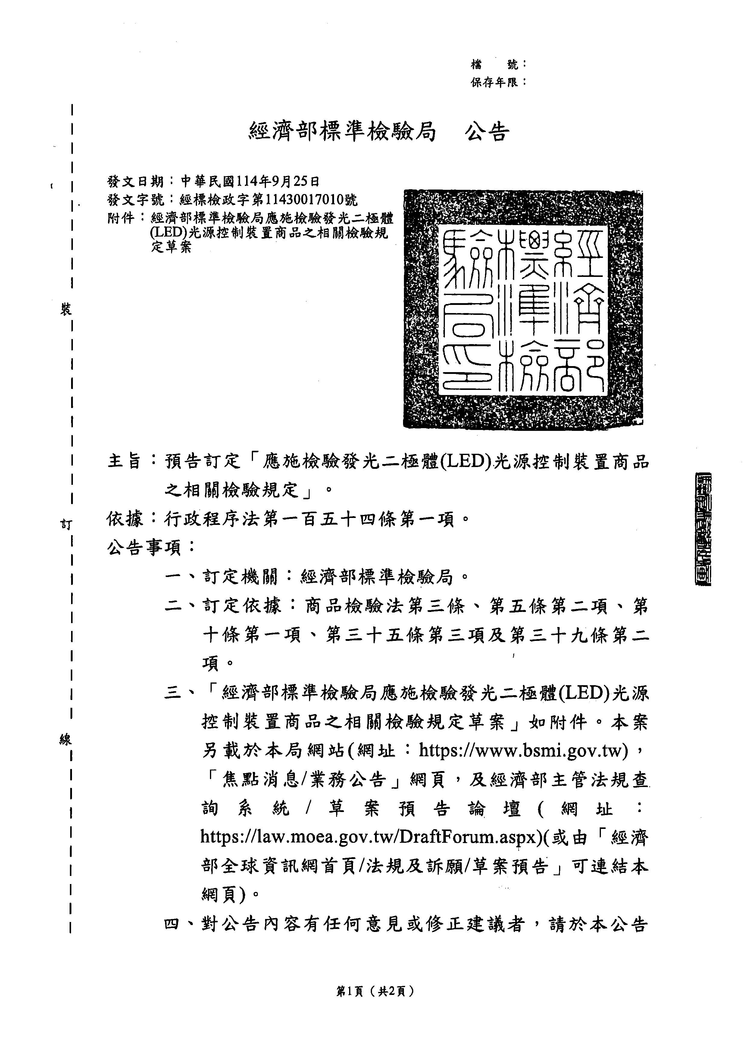 經濟部標準檢驗局:預告訂定「應施檢驗發光二極體(LED)光源控制裝置商品之相關檢驗規定」草案。