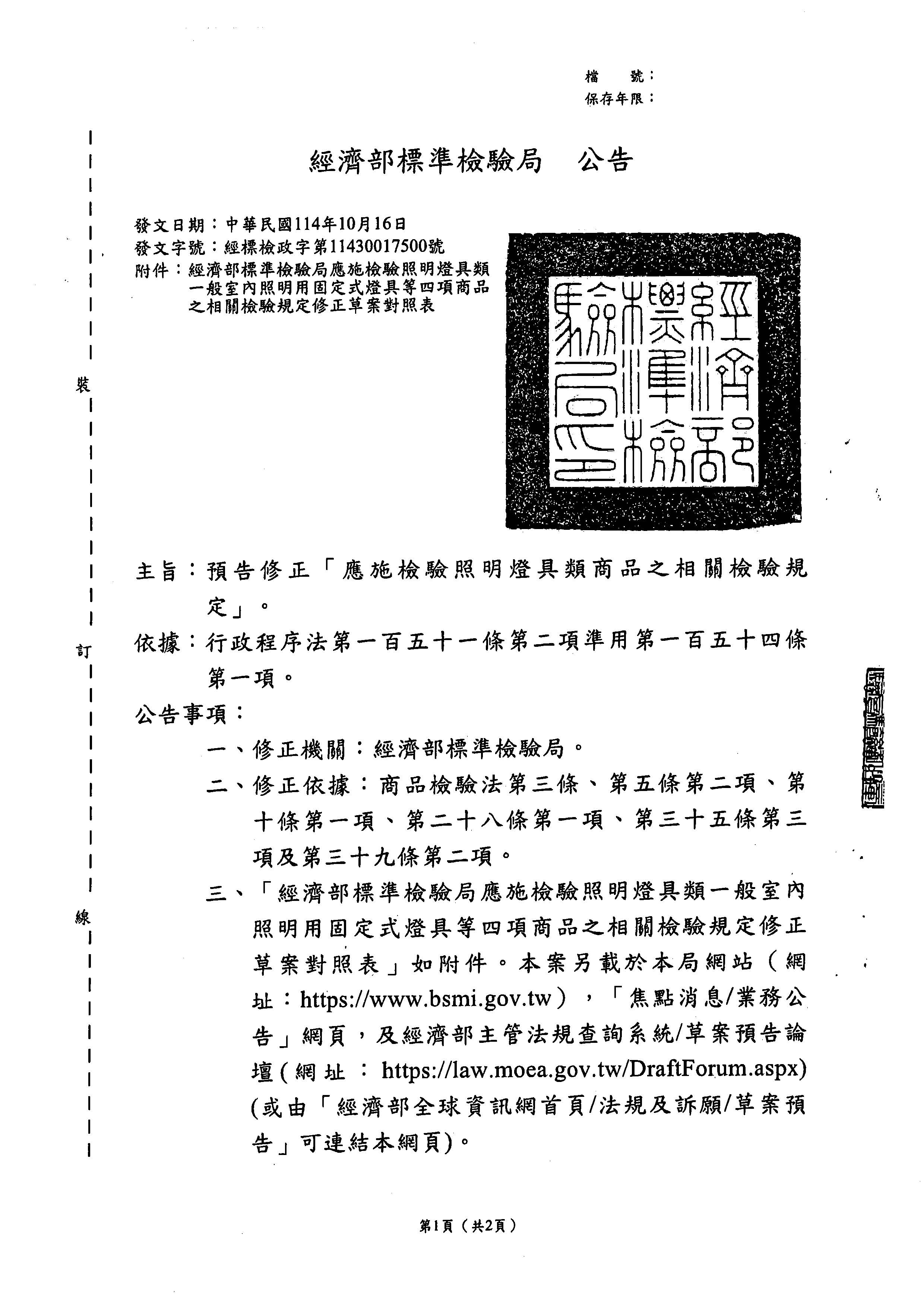 【標檢局】「應施檢驗照明燈具類商品之相關檢驗規定」修正草案