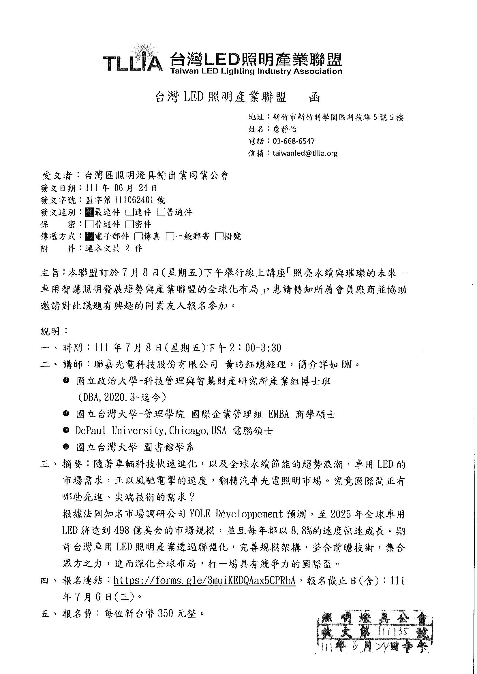 「照亮永續與璀璨的未來---車用智慧照明發展趨勢與產業聯盟的全球化布局」線上講座