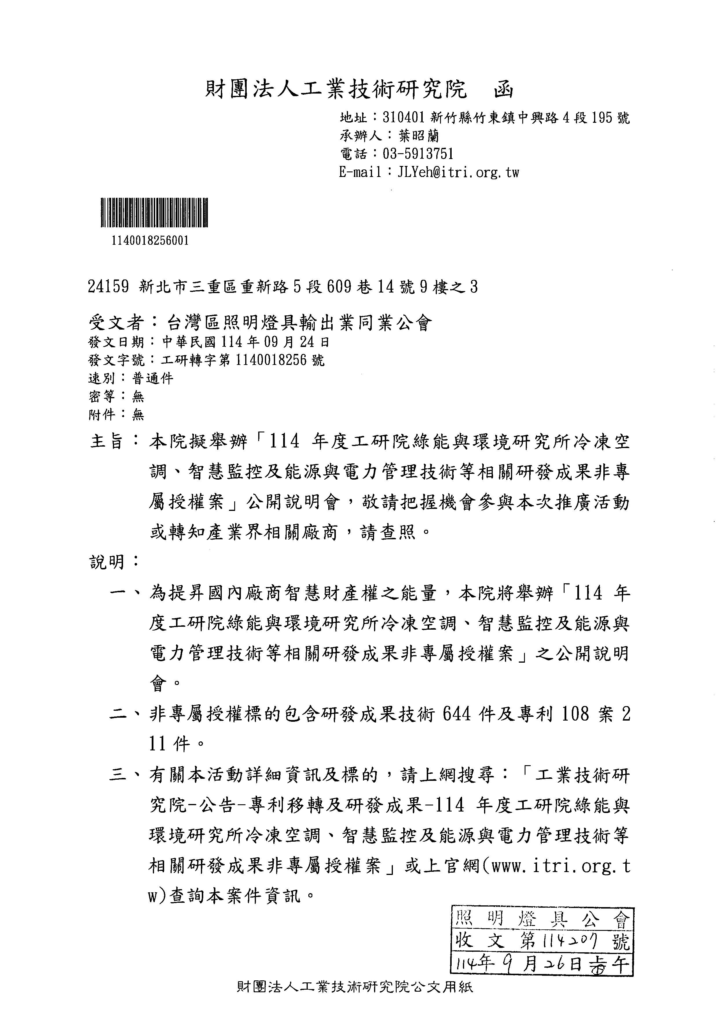 財團法人工業技術研究院:綠能與環境研究所辦理「114年度工研院冷凍空調、智慧監控及能源與電力管理技術等相關研發成果非專屬授權案」公開說明會。