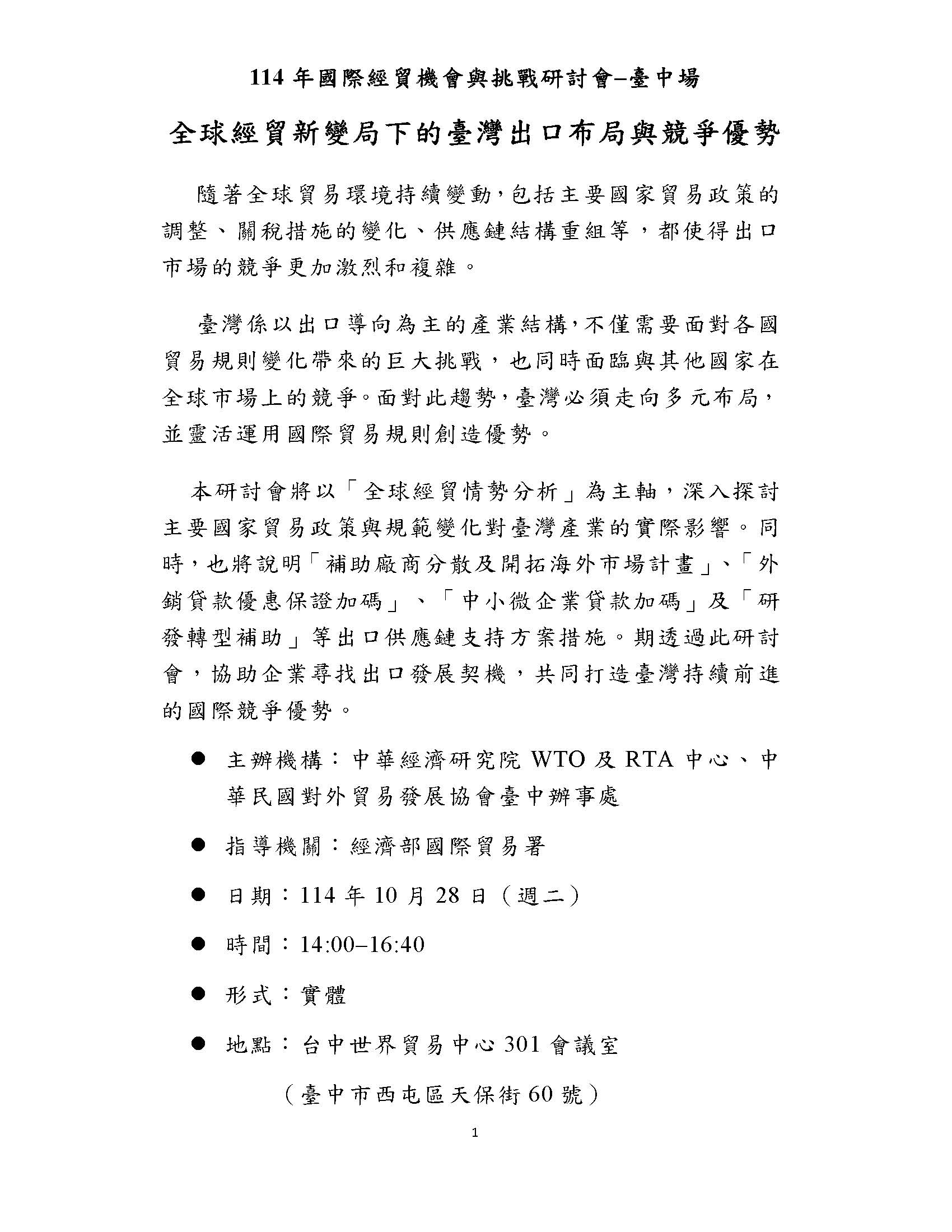 主辦機構:中華經濟研究院WTO及RTA 中心、中華民國對外貿易發展協會臺中辦事處