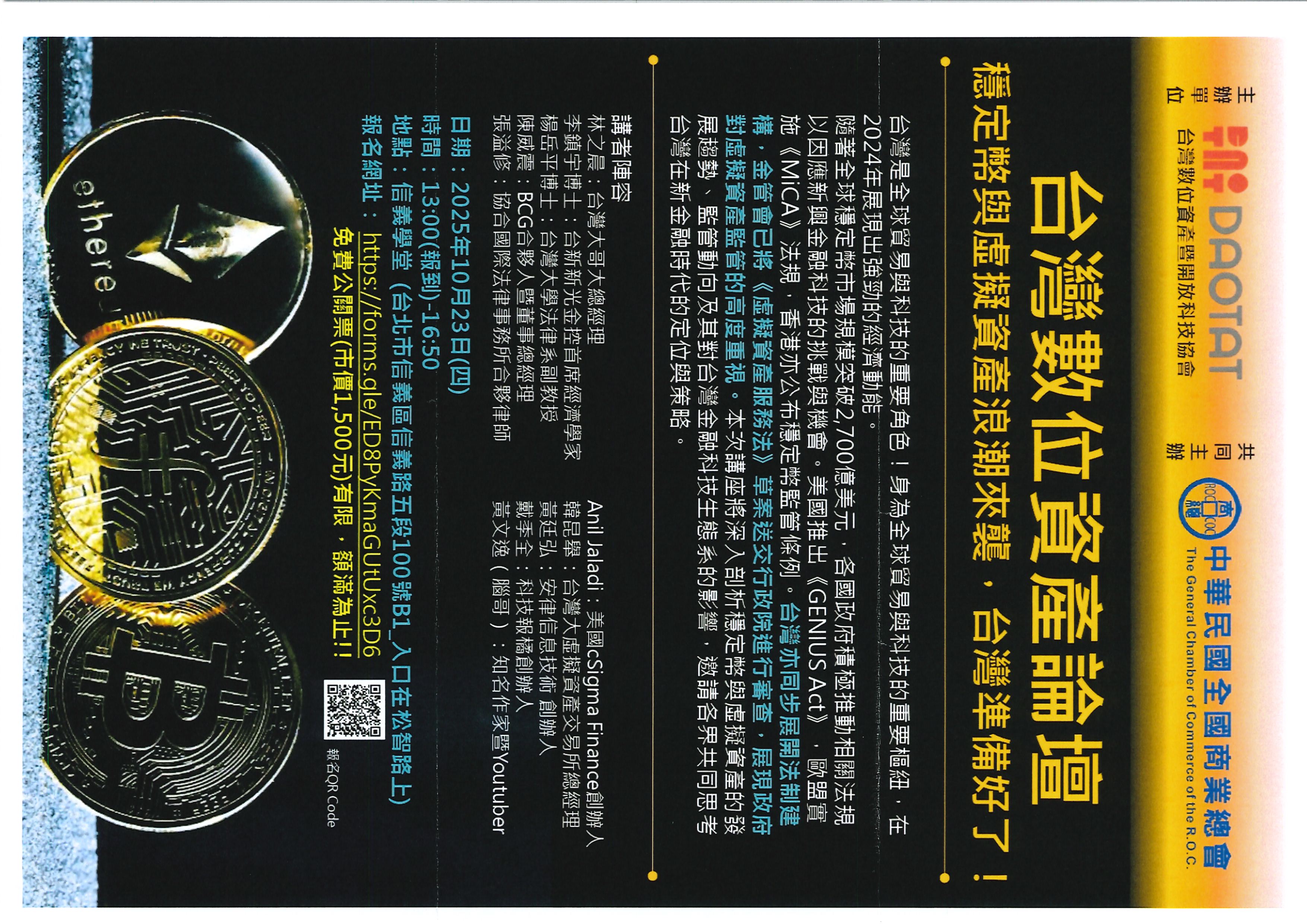 中華民國全國商業總會與台灣數位資產暨開放科技協會:共同舉辦「台灣數位資產論壇-穩定幣與虛擬資產浪潮來襲,台灣準備好了!」講座論壇。