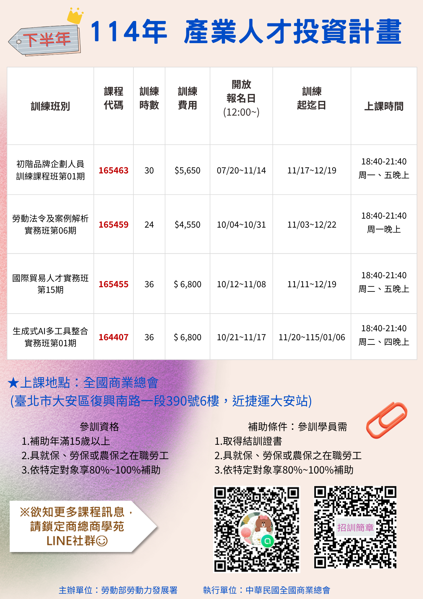中華民國全國商業總會辦理「114年產業人才投資計畫」政策性課程招生中,請踴躍報名。