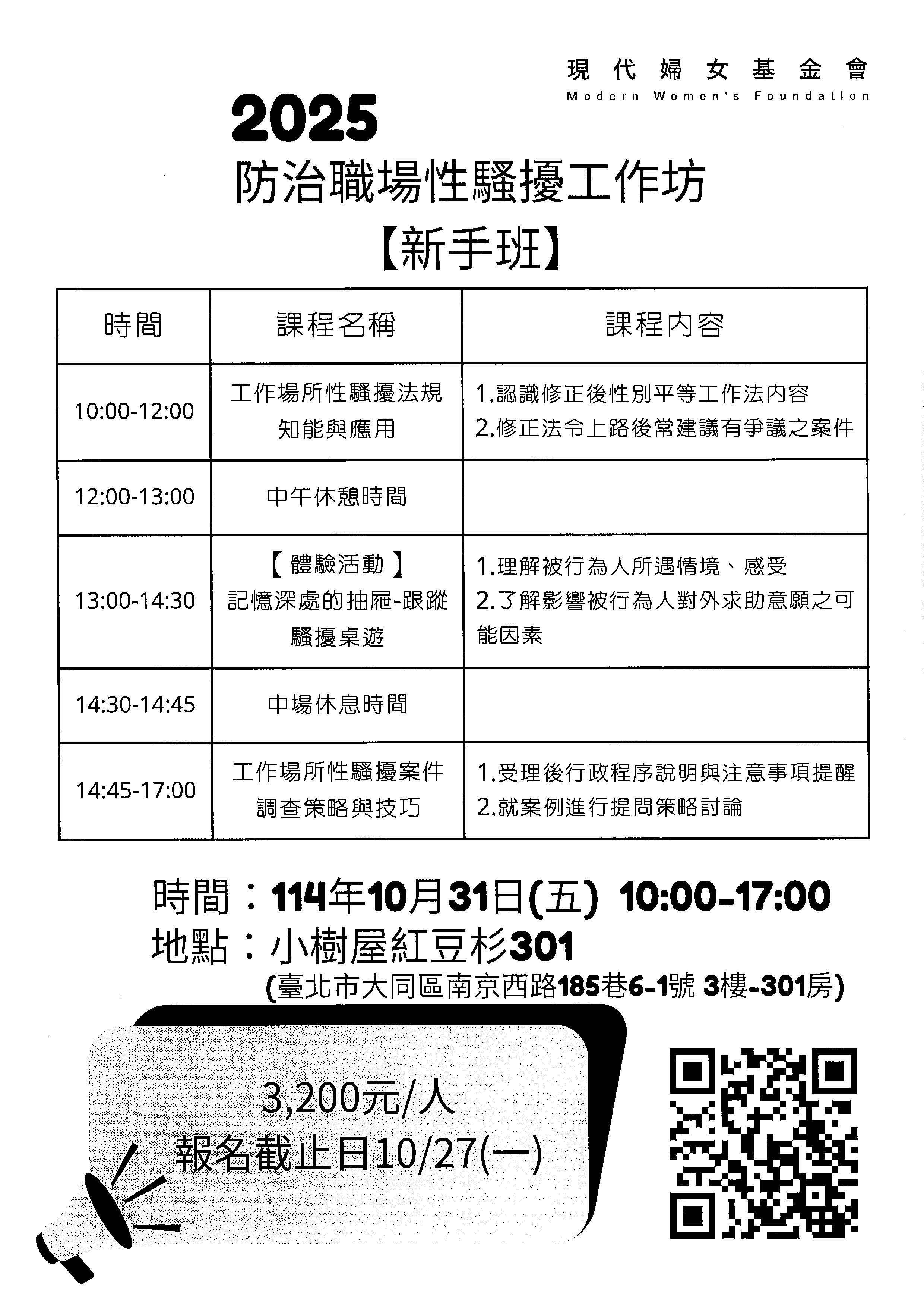 財團法人現代婦女教育基金會:舉辦「2025防治職場性騷擾工作坊」講習。