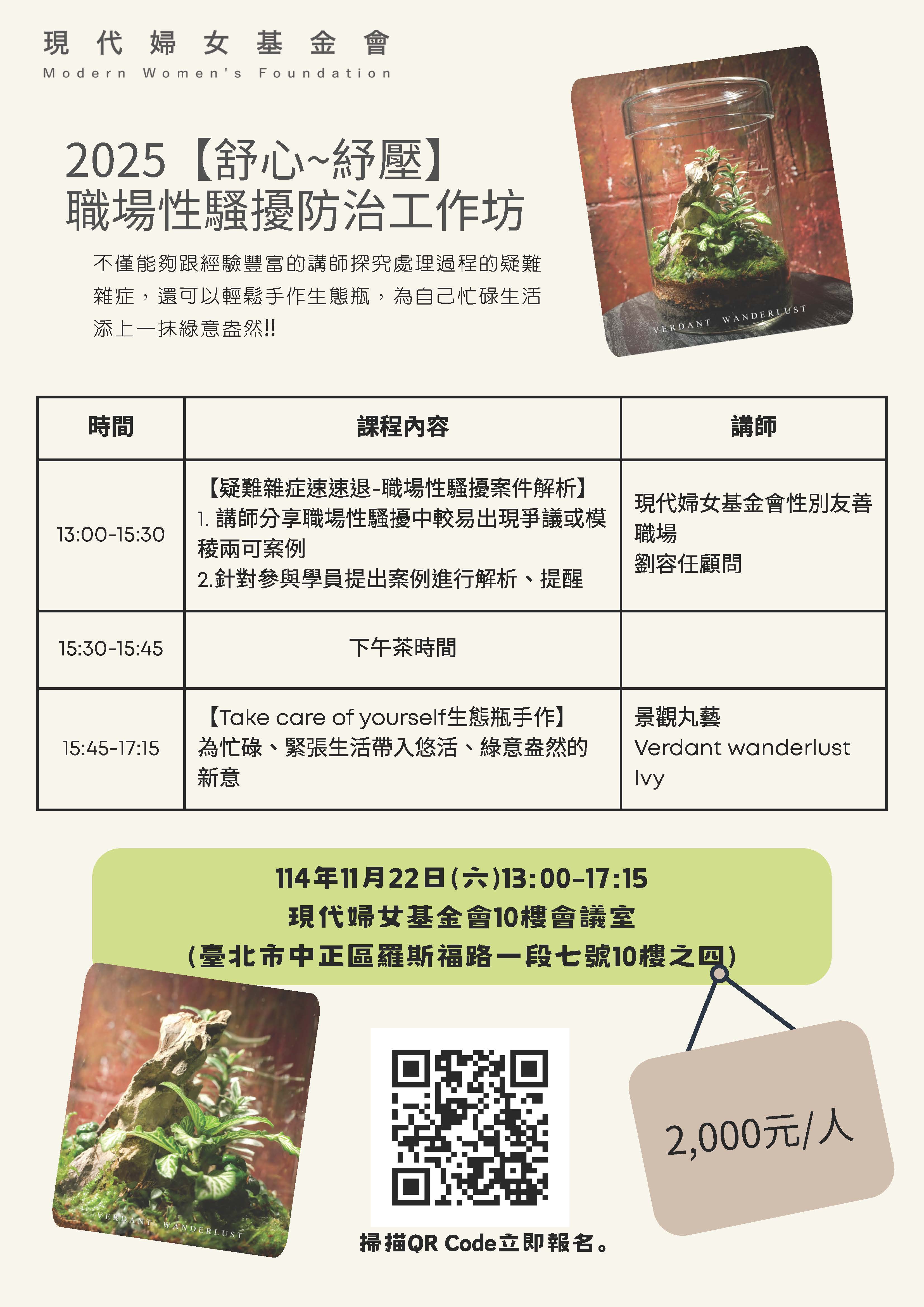 財團法人現代婦女教育基金會:舉辦 2025【舒心~紓壓】防治職場性騷擾工作坊。