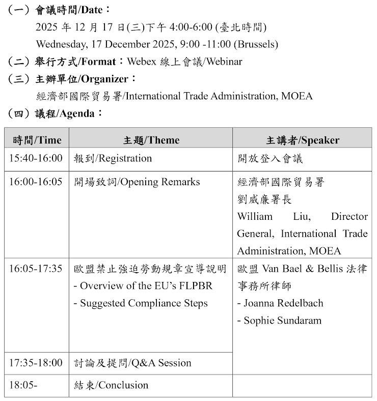 經濟部國際貿易署為協助我國業者掌握歐盟法規要求與最新執法趨勢,使企業得以及早因應符合規範並落實法遵,本次說明會特邀歐盟Van Bael amp; Bellis法律事務所說明歐盟禁止強迫勞動產品規章之要求及確保業者合規之策略,希望協助業者提前因應國際法規變化,提升競爭力與供應鏈韌性。