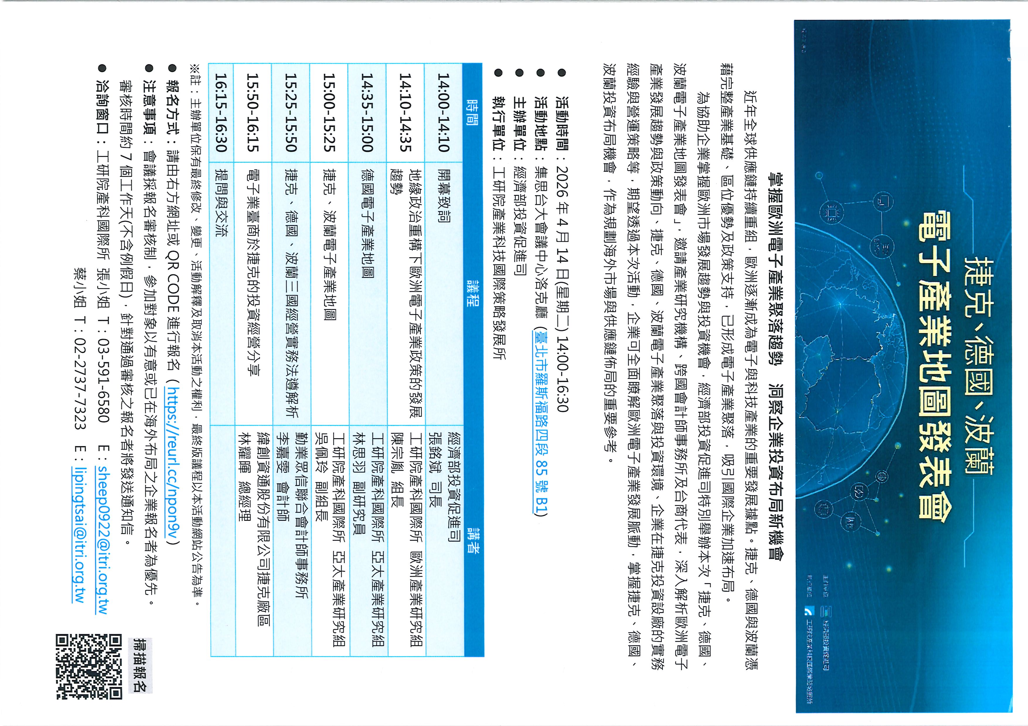為協助企業掌握歐洲市場發展趨勢與投資機會,經濟部投資促進司特別舉辦本次「捷克、德國、波蘭電子產業地圖發表會」,邀請產業研究機構、跨國會計師事務所及台商代表,深入解析歐洲電子產業發展趨勢與政策動向、捷克、德國與波蘭電子產業聚落與投資環境、企業在捷克投資設廠的實務經驗與營運策略等,期望透過本次活動,企業可全面瞭解歐洲電子產業發展脈動,掌握捷克、德國與波蘭投資布局機會,作為規劃海外市場與供應鏈佈局的重要參考。
